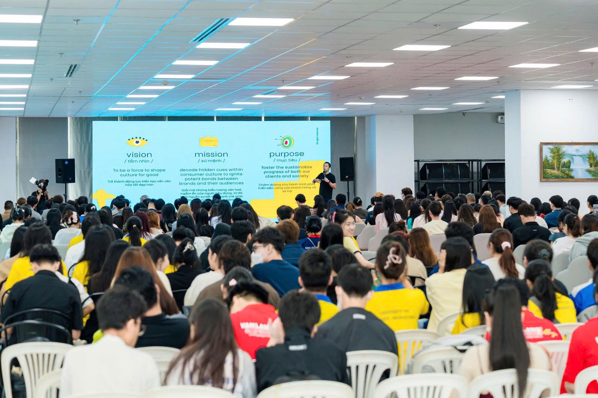 Toàn cảnh hội trưởng phiên chia sẻ của 6 diễn giả tại Diễn đànSong song với phiên thảo luận, sinh viên và khách tham dự còn được khám phá Innovation Hub, nơi trưng bày các giải pháp truyền thông ứng dụng thực tế ảo (VR), trí tuệ nhân tạo, cùng các nền tảng đa phương tiện. Hơn 30 gian hàng quảng cáo sáng tạo và 100 cơ hội việc làm được giới thiệu, mang đến cầu nối trực tiếp giữa doanh nghiệp và thế hệ trẻ đam mê sáng tạo.